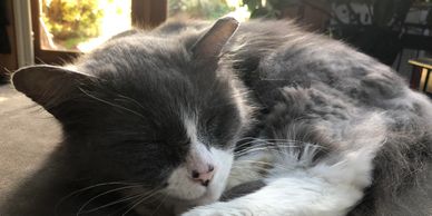 Henry was a feral resident of the Sanctuary for eight years. He is a handsome guy with long, fluffy grey and white fur with piercing green eyes. Henry spent a lot of time sitting on his own, quiet and withdrawn, with his back to the other cars in the Sanctuary on a cat tree platform. He seemed to have little interest in being adopted or getting to know his human caretakers.